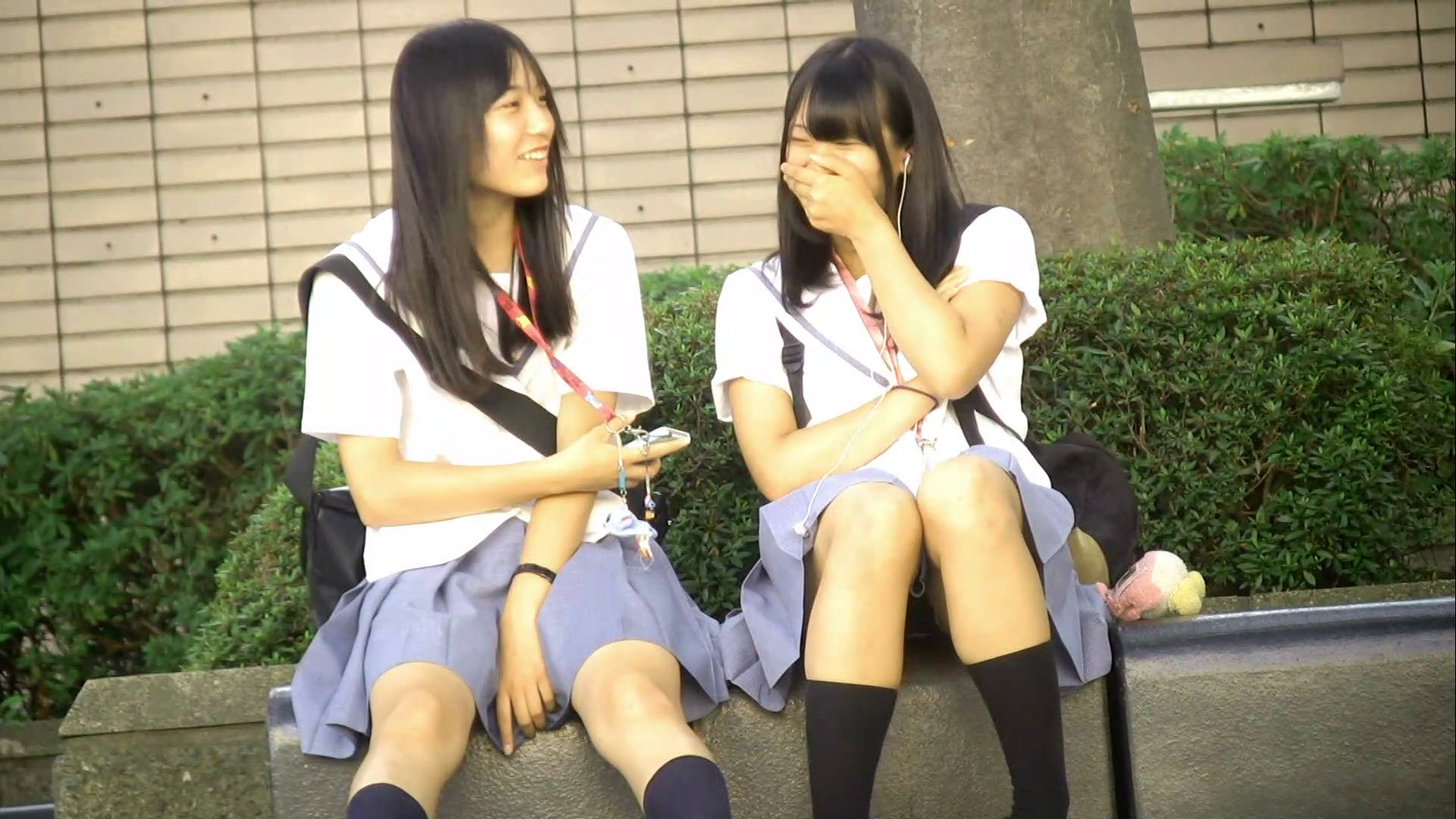 Young Japanese schoolgirls sitting on the floor, their panties are being filmed (wardrobe malfunctions).