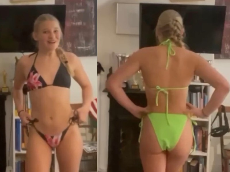 This beautiful young blonde teenager shows us her new bikini collection for this summer. There are 6 tight and sexy bikinis.